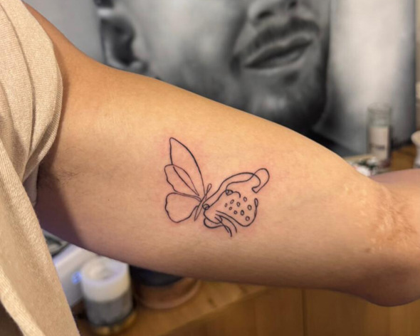 ע' מרים מעט את שרוול שמאל, ומציג לי את הקעקוע השני - פרפר ונמר, זיכרון מרעי. "הוא הרי בדיוק השילוב הזה - חד, התקפי וחזק, ובה בעת רגיש ואמפתי", הוא מסביר.