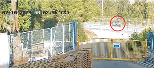 מצלמת אבטחה מספר 1 בשער הגד"ש בקיבוץ בארי )צופה לכיוון צפון־ מזרח (צילמה שני טנדרים שהגיעו למסיבת 'הנובה' במהלך נסיעתם על כביש 232 לכיוון דרום. 37