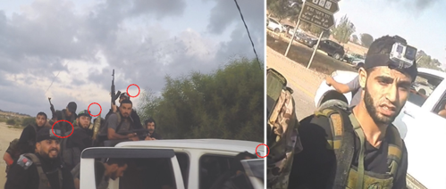 מימין: מחבל נושא מצלמת ראש מסוג גֹו־ּפרֹו במרחב 'הנובה.' משממאל: מספר מצלמות גֹו־ּפרֹו בכוח של 11 מחבלים בדרך להתקפה על מעבר ארז.