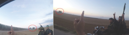 כך לדוגמה, התמונות שלהלן, צולמו על ידי שני נושאי מצלמה שיעדם מחנה רעים במהלך קרב קצר מול הכניסה המערבית לקיבוץ כיסופים. נושא מצלמת הראש שישב בג'יפ (ומשתקף במראת הצד של) הגיע לצומת זמן קצר אחרי