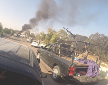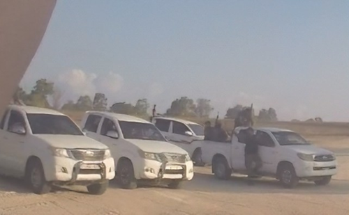 טנדרים לבנים, חלקם ללא מספר רישוי, בדרך אל 'הנובה34.'