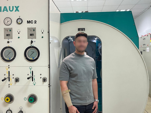 על מר"י (מרכז רפואה ימית) אולי שמעתם בעבר: מרפאה ובה תאי לחץ, המיועדים במקור לטיפול בנפגעי תאונות צלילה וטראומה אקוסטית. לאורך המלחמה, הורחב תחום האחריות של המרכז גם לנפגעי תקריות אחרות. בין המטופלים - סרן ר', סמ"פ בגדוד 601 של ההנדסה הקרבית, שנפצע בתחילת המלחמה בפעילות התקפית ברצועת עזה.