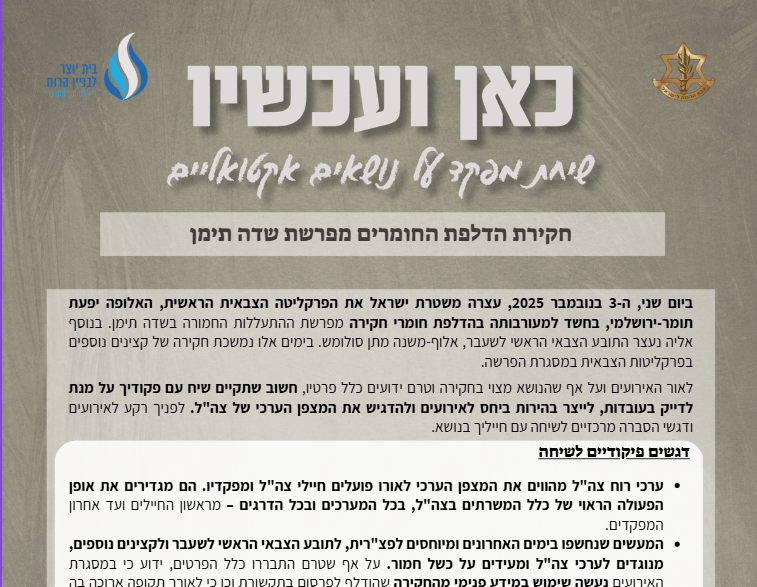 לאור האירועים ועל אף שהנושא מצוי בחקירה וטרם ידועים כלל פרטיו, חשוב שתקיים שיח עם פקודיך על מנת לדייק בעובדות, לייצר בהירות ביחס לאירועים ולהדגיש את המצפן הערכי של צה"ל. לפניך רקע לאירועים ודגשי הסברה מרכזיים לשיחה עם חייליך בנושא.