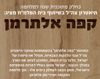 מחזה מוזיקלי המשלב את שיריו הקלאסיים של נתן אלתרמן עם סיפור מרתק המתרחש בתקופה שלאחר אירועי השביעי באוקטובר. דרך דמויות מגוונות שחוות קונפליקטים פנימיים וחברתיים, המחזה מציג את המורכבויות של התקופה בצורה קלילה ונוגעת ללב. השירים של אלתרמן משתלבים בעלילה ומעניקים רגעים של עומק והתרוממות רוח.