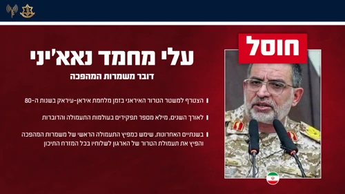 11:14 | חיל האוויר בהכוונת אמ"ן תקף במהלך הלילה וחיסל את עלי מחמד נאא'יני, דובר וראש מערך יחסי הציבור של משמרות המהפכה.