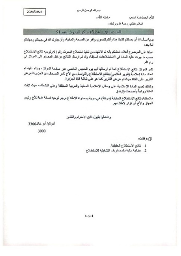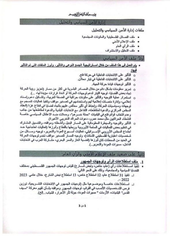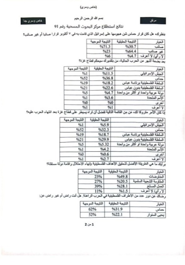 צה״ל חושף מסמכים של מנגנון הביטחון הכללי של חמאס, אשר אותרו על-ידי כוחות צה"ל הפועלים ברצועת עזה. המסמכים מוכיחים מאמץ נרחב של ארגון הטרור לזייף את תוצאות הסקרים של מכון "PSR", על מנת לייצר מצג שווא של תמיכת הציבור העזתי בארגון הטרור, במיוחד לאחר טבח השבעה באוקטובר.