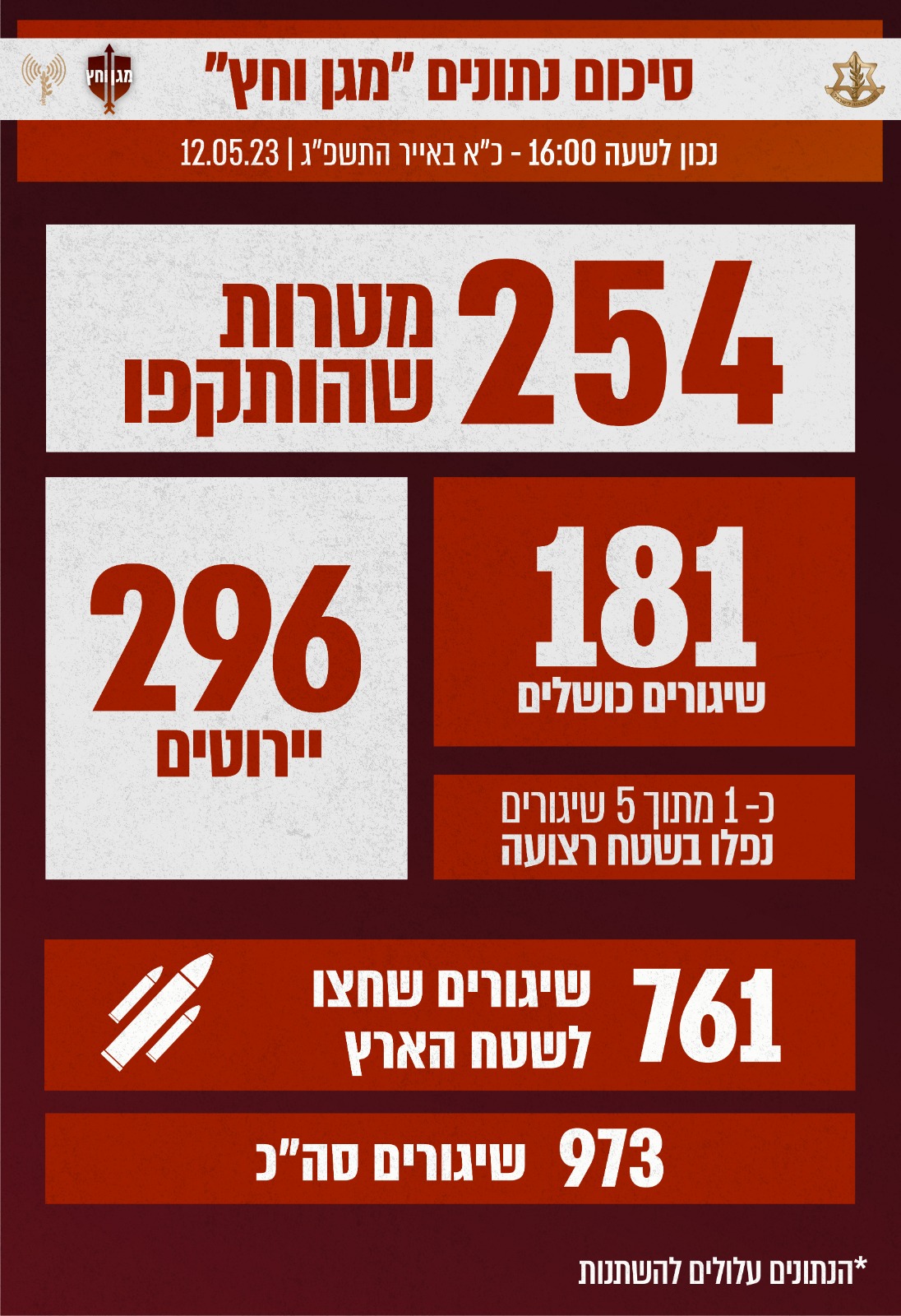 507 שיגורים סה"כ. מתוכם 368 חצו לשטח הארץ ו-110 שיגורים כשלו. כ-1 מתוך 5 שיגורים נפלו בשטח הרצועה. בוצעו כ-154 יירוטים.