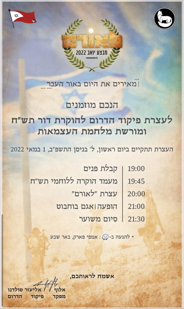 במסגרת העצרת נספר את סיפור הקמתה של מדינת ישראל ואת סיפורי הקרבות שנערכו בגזרת הדרום במלחמת העצמאות, נקיים מעמד זיכרון ללוחמי תש״ח ונציין 70 שנה ללהקת פיקוד הדרום עם שלל שירים מכל הזמנים.
