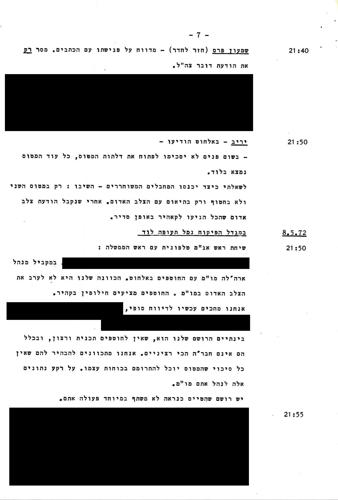 01:40- שר הביטחון: "שמעון פרס מספר, הודיעו לו מיאט"א, שארגון ספטמבר השחור בבירות רוצה להתקשר עם המטוס דרך מגדל הפיקוח של בירות. הלבנונים לא מתירים להם זאת. השגריר הבלגי מבירות מוכן לבוא הנה לנסות לפעול, לתווך."