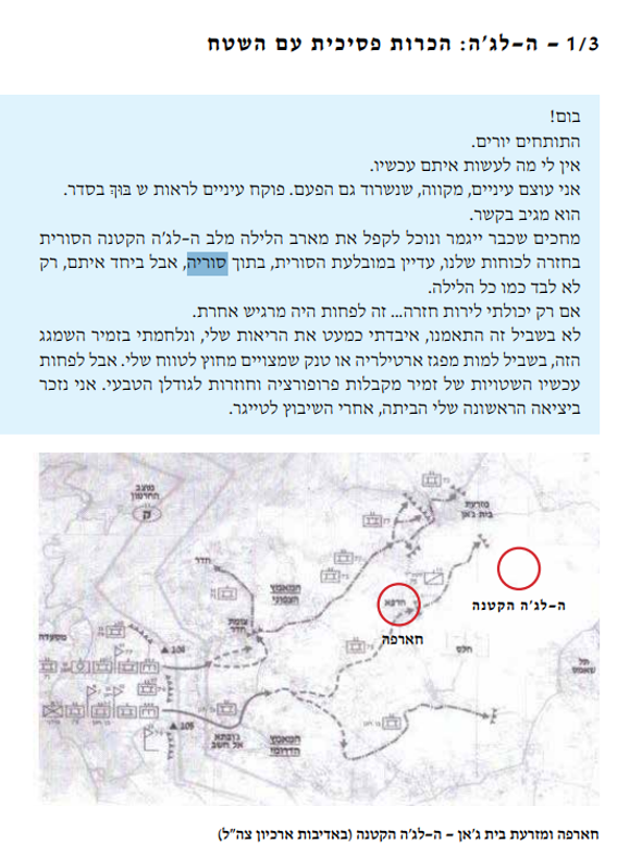 כשסיימנו את השיחה, י' התחיל לספר על חבריו לצוות, על המפקדים שלו, ועל אחוות השריונרים-מוהנדסים שהם דוגלים בה. ולמשמע דבריו של נכדו, ביקש צבי דבר אחרון: למסור דרישת שלום למ"פ שלו מאותה התקופה, רס"ן שמוליק דור: "הוא היה המ"פ - בה' הידיעה. אני מקווה שגם לך יש מפקדים כאלה".