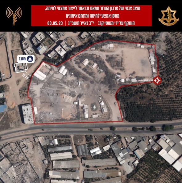 מטוסי קרב תקפו מתחם ששימש כמחנה אימונים בארגון הטרור חמאס ומוצב צבאי של הארגון ובו מחסן אמצעי לחימה, אתר לייצור אמצעי לחימה ומתחם אימונים של הארגון.