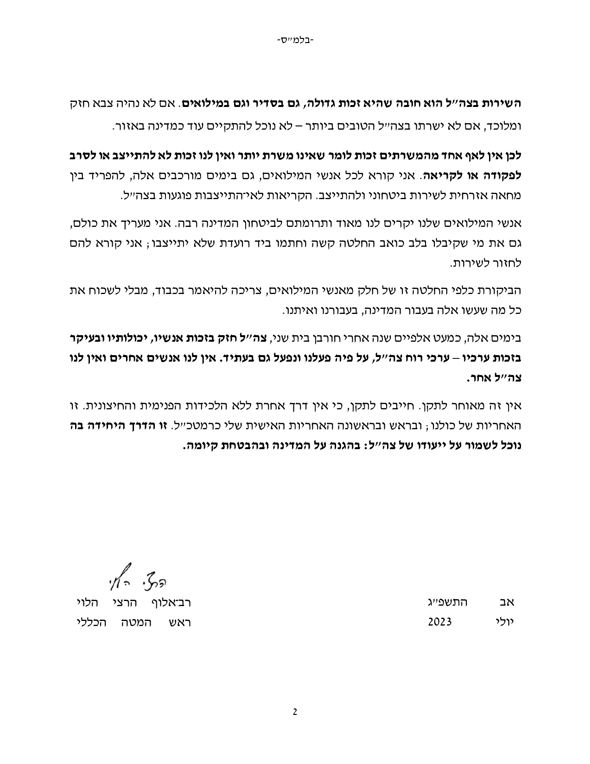 לכן אין לאף אחד מהמשרתים זכות לומר שאינו משרת יותר ואין לנו זכות לא להתייצב או לסרב לפקודה או לקריאה. אני קורא לכל אנשי המילואים, גם בימים מורכבים אלה, להפריד בין מחאה אזרחית לשירות ביטחוני ולהתייצב. הקריאות לאי־התייצבות פוגעות בצה"ל.