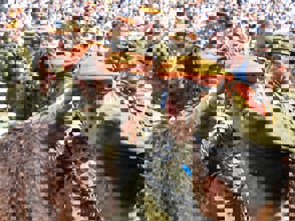 08:50: רגע השיא מגיע. את כומתות הבקו"ם מחליפות 400 כומתות כתומות. ברגע שהן עולות למעלה ומקשטות את השמיים, ההורים צוהלים ומוחאים כפיים.