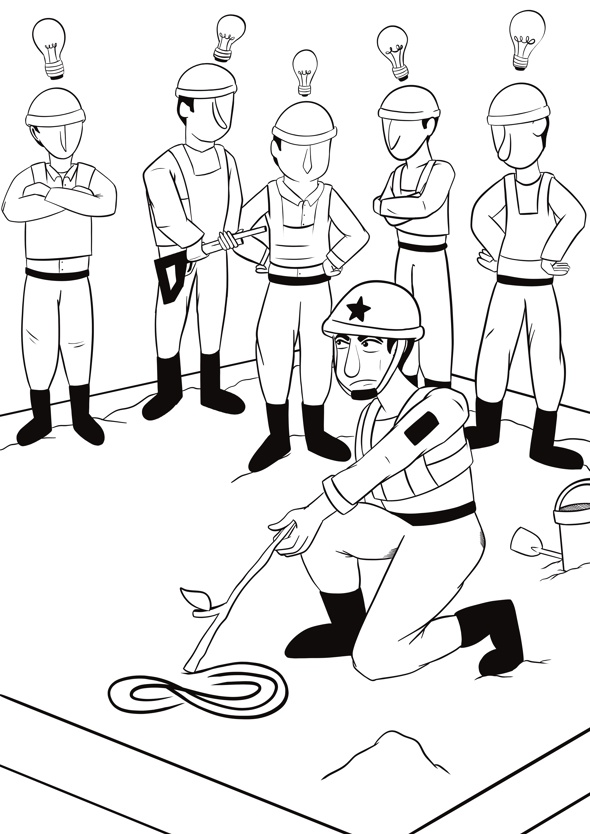 בדומה למעשה החלוציות, בצה"ל גם מי שאינו מחזיק בידע שכרוך בלימודים ובהכשרה מרובה בכוחו להשתתף במעשה החדשנות. מי שהוגה את המיזם לא יהיה בהכרח מי שבכוחו להוציאו לפועל[3], אך סביר כי אילולא המוח ההוגה לא היה מוצר זה קיים. על המפקדים מוטל להשתית במוחם של חייליהם את התובנה כי גם הם יכולים להיות אותו מוח הוגה, גם אם לא ידעו שהם כאלה.