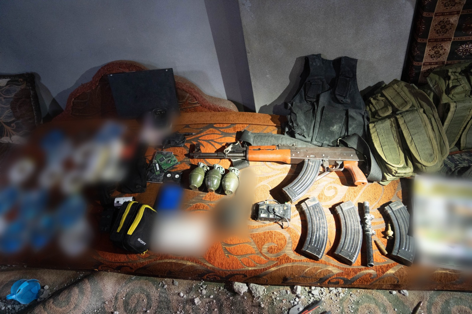 كما رصد مقاتلو وحدة "اغوز" في بنية تحتية إرهابية تقع في منزل سكني مدني العديد من الوسائل القتالية متمثلةً بوالقنابل اليدوية وقطع الأسلحة ومخازنها والسترات التي استخدمها مخربو منظمة حماس الإرهابية.