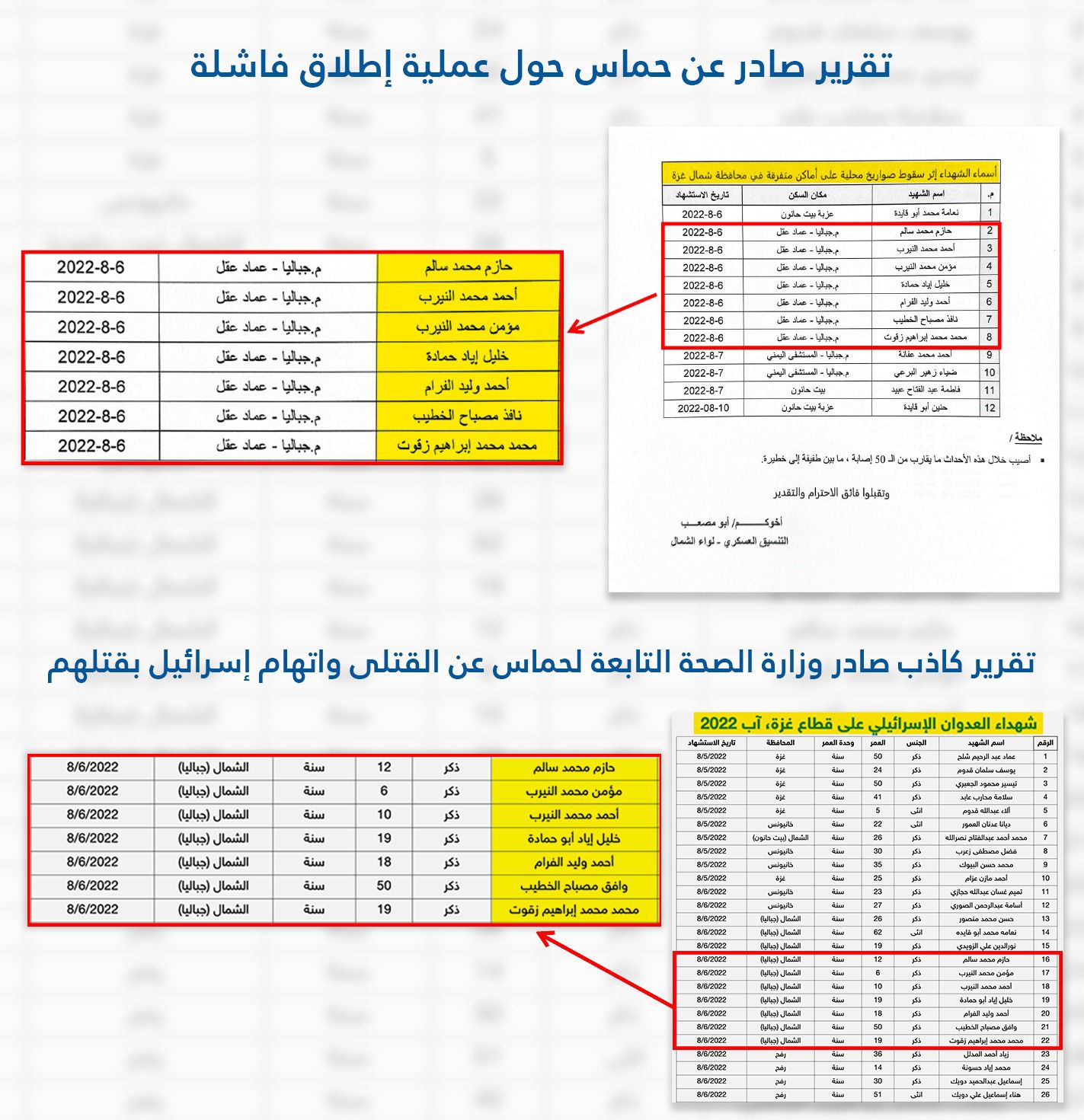 ورغم إشارة التقارير الحمساوية بوضوح إلى مقتلهم نتيجة عمليات الإطلاق الفاشلة، إلا أن التقرير الذي صدر عن وزارة الصحة في القطاع زعم انهم قُتلوا نتيجة غارة إسرائيلية.