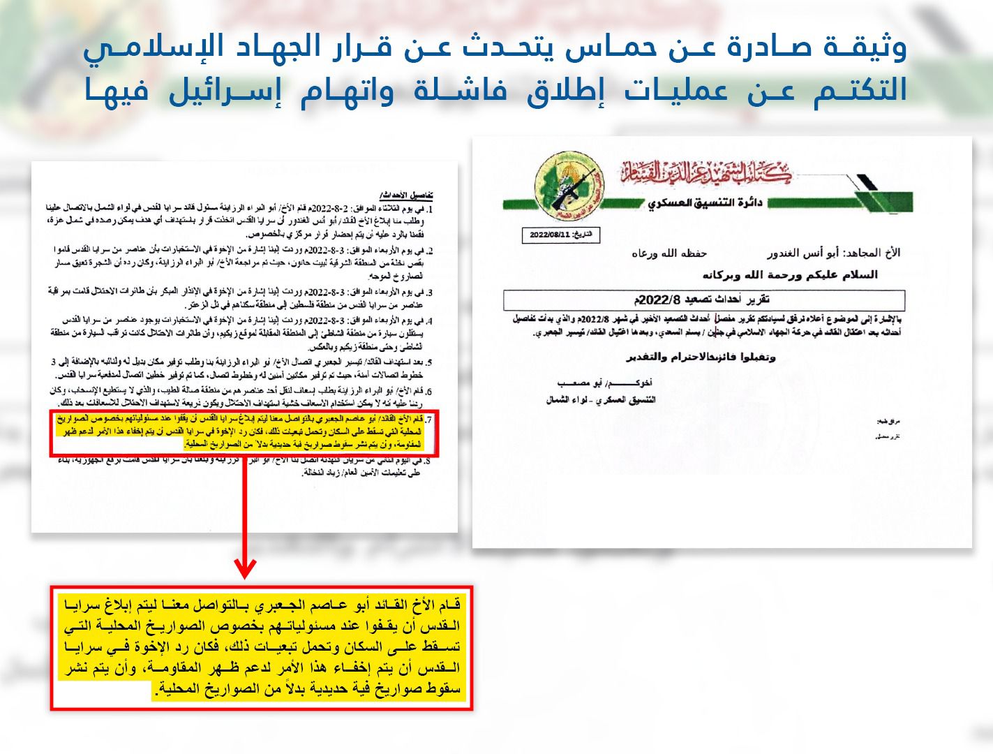 كما يكشف جيش الدفاع عن وثيقة أخرى مؤرخة إلى عام 2022 والتي صدرت عن دائرة التنسيق العسكري التابعة لحماس، وتسرد طريقة عمل سرايا القدس الجناح العسكري للجهاد الإسلامي، التي نفذت عملية إطلاق فاشلة تسببت بإصابة عدد من الأشخاص خلال عملية "الفجر الصادق"، على إخفاء هذه الحادثة واقتراحها تقديم الحادثة وكأنها عبارة عن سقوط صاروخ اعتراضي أطلقته منظومة القبة الحديدية بغية لصق التهمة بإسرائيل.