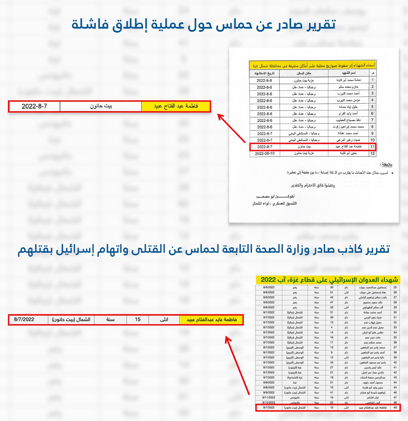 وبين جملة الأمور تظهر فيه أسماء القتلى السبعة نتيجة إصابة قذيفة صاروخية محلية بالقرب من مسجد عماد عقل في جباليا، حيث يظهر هناك اسم فاطمة عايد عبد الفتاح عبيد التي قُتلت جراء عملية إطلاق فاشلة في بيت حانون.