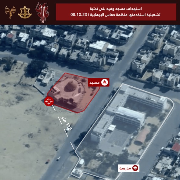 بالإضافة إلى ذلك، تم تدمير عقار عملياتي تستخدمه حماس يقع في قلب مسجد في منطقة جباليا. كما وتم تدمير أحد الأصول التي تستخدمها استخبارات التنظيم، وأحد الأصول التي تستخدمها حماس لتوجيه نشاطها الإرهابي. ويواصل جيش الدفاع شن الهجمات على قطاع غزة وتوجيه ضربات قاتلة لقدرات حماس.