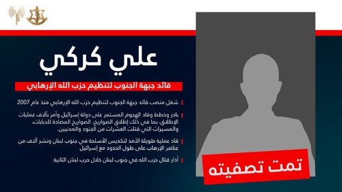 قضى جيش الدفاع أمس على المدعو حسن نصرالله زعيم تنظيم حزب الله الارهابي وأحد مؤسسيه. كما قضى جيش الدفاع على المدعو علي كركي قائد جبهة الجنوب في حزب الله الارهابي وعدد آخر من القادة في حزب الله.