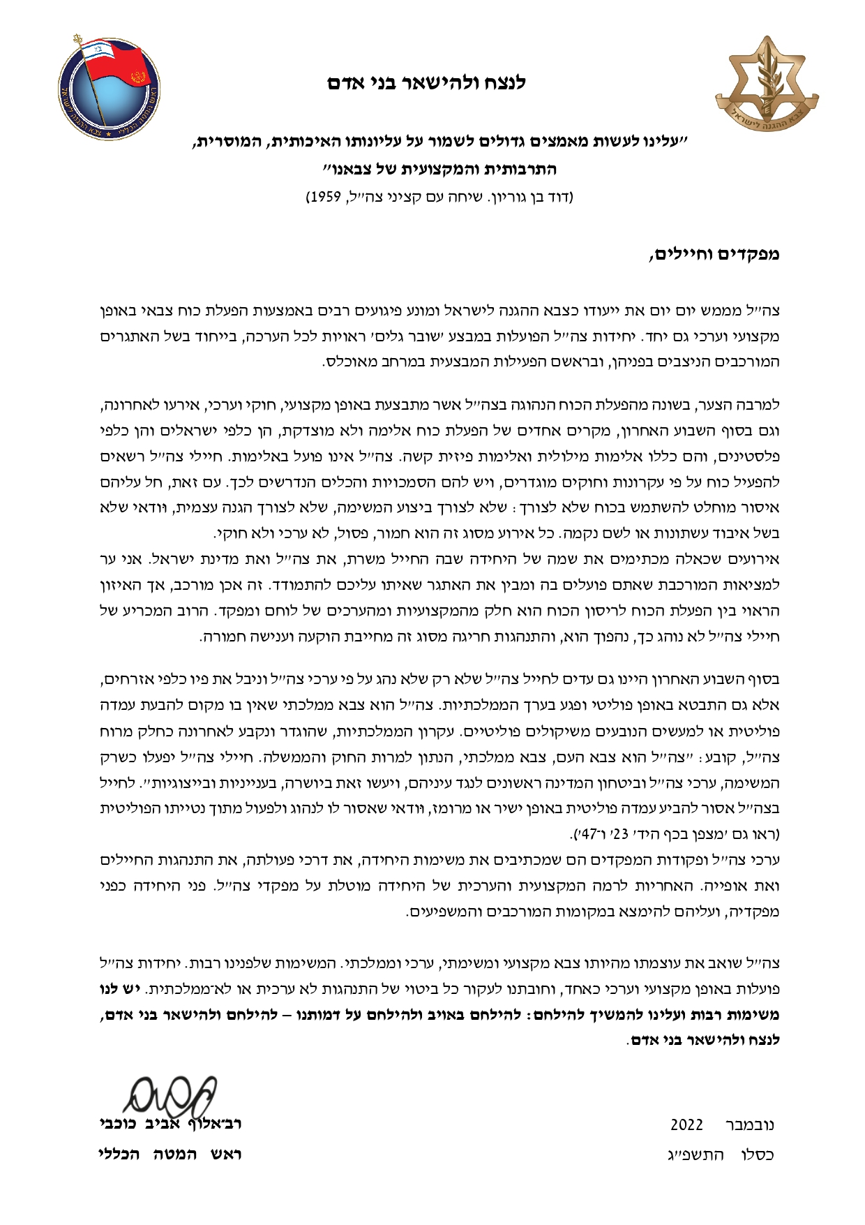 The IDF derives its strength from being a professional and mission-oriented, moral and stately military. The tasks before us are many. IDF units operate both professionally and ethically, and it is our duty to uproot any expression of unethical or unstately behavior that fails to represent this principle. We have many tasks, and we must continue to fight: fight the enemy and fight for our image—to fight and maintain our humanity, to win and maintain our humanity.