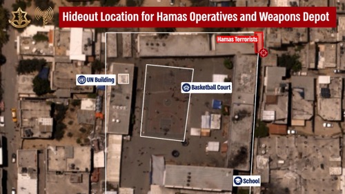Following IDF and ISA intelligence, the IAF carried out a precise strike on a compound located inside an UNRWA school where Hamas terrorists - including an anti-tank missile operative and a Nukhba terrorist - were operating. The compound that was struck also contained weapons, including mortars and explosives, as evidenced by the numerous secondary explosions after the strike. The strike was carefully planned and carried out using precise munitions to mitigate any harm to civilians in the area.