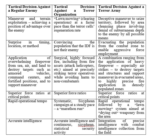 From the above, it is clear that decisively defeating terror organizations or terror armies at the tactical level is not an event achievable in six days, nor within a short timeframe similar to that in which IDF forces crossed the Suez Canal and encircled the Third Army during the Yom Kippur War (19 days of pure combat). The former U.S. Chairman of the Joint Chiefs of Staff, Admiral Michael Mullen, stated that "success in this type of war will always be protracted, not decisive. There will be no single day when we stand and say, 'It’s over. We won.' We will win, but only over time and only after a continual process of reassessment and adaptation. Honestly, it will not feel like someone who just delivered a knockout blow, but rather like someone recovering from a long illness" (Shelah, 2015, p. 79).