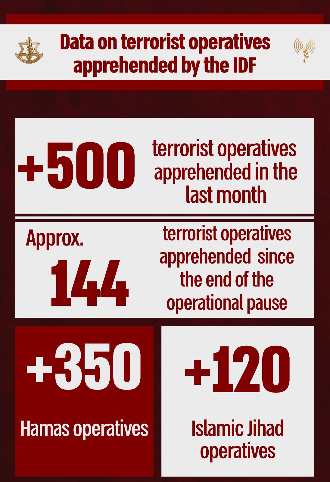 In the past month, a total of over 350 Hamas terrorist operatives were apprehended by the IDF and ISA. In addition, over 120 Islamic Jihad terrorist operatives were apprehended. Overall, over 500 terrorist operatives were apprehended in Gaza and were transferred to Israeli territory for further questioning.