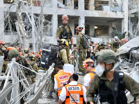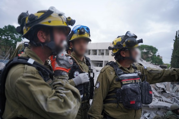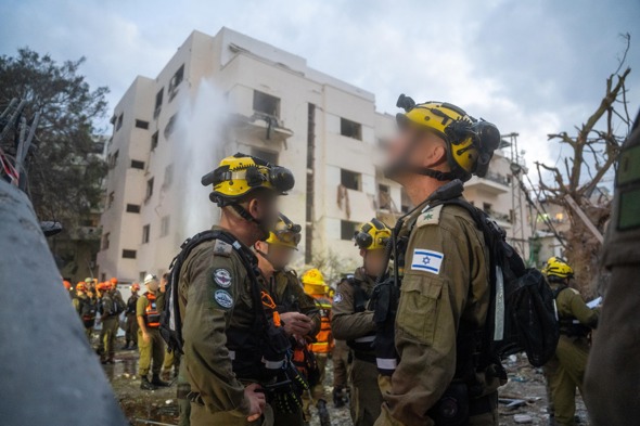 Home Front Command personnel, both in mandatory and reserve duty, are deployed and operating simultaneously at multiple impact sites, carrying out extensive search and rescue efforts.