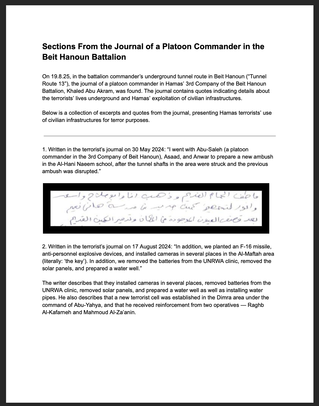 On 19.8.25, in the battalion commander’s underground tunnel route in Beit Hanoun (“Tunnel Route 13”), the journal of a platoon commander in Hamas’ 3rd Company of the Beit Hanoun Battalion, Khaled Abu Akram, was found. The journal contains quotes indicating details about the terrorists’ lives underground and Hamas’ exploitation of civilian infrastructures.