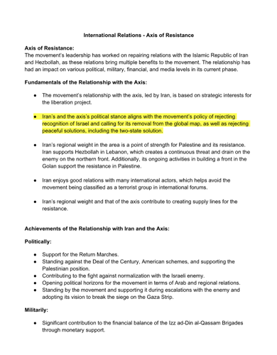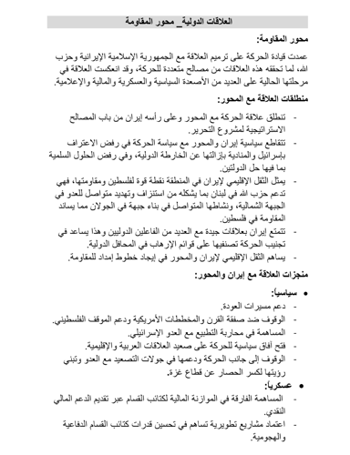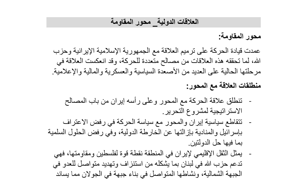 Iran’s and the Axis’s political stance aligns with the movement’s policy of rejecting recognition of Israel and calling for its removal from the global map, as well as opposing peaceful solutions, including the two-state solution. The movement’s leadership has worked to repair its relations with the Islamic Republic of Iran and Hezbollah, as these ties provide multiple benefits to the movement.