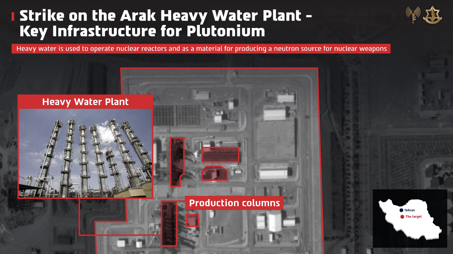 Separately, following the identification of renewed reconstruction efforts, the Israeli Air Force targeted the heavy water plant in Arak in central Iran. Heavy water is a unique material used to operate nuclear reactors such as the inactive reactor in Arak, which was originally designed to be capable of producing military-grade plutonium. These materials are also used as a material to produce a neutron source for nuclear weapons.