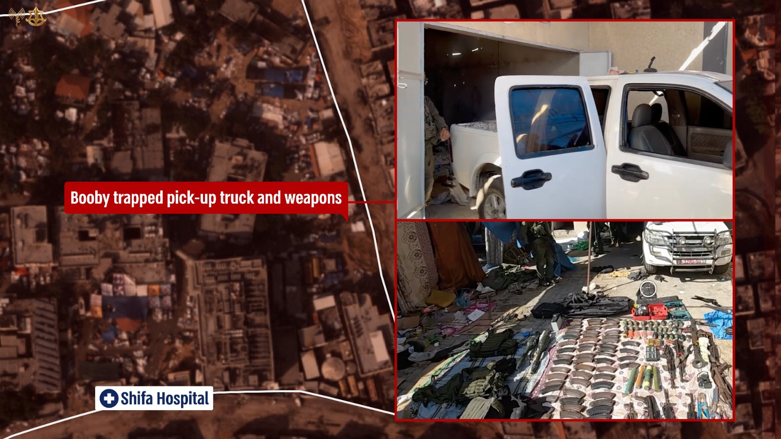 The tunnel shaft was uncovered in the area of the hospital underneath a shed alongside a vehicle containing numerous weapons including RPGs, explosives, and Kalashnikov rifles.