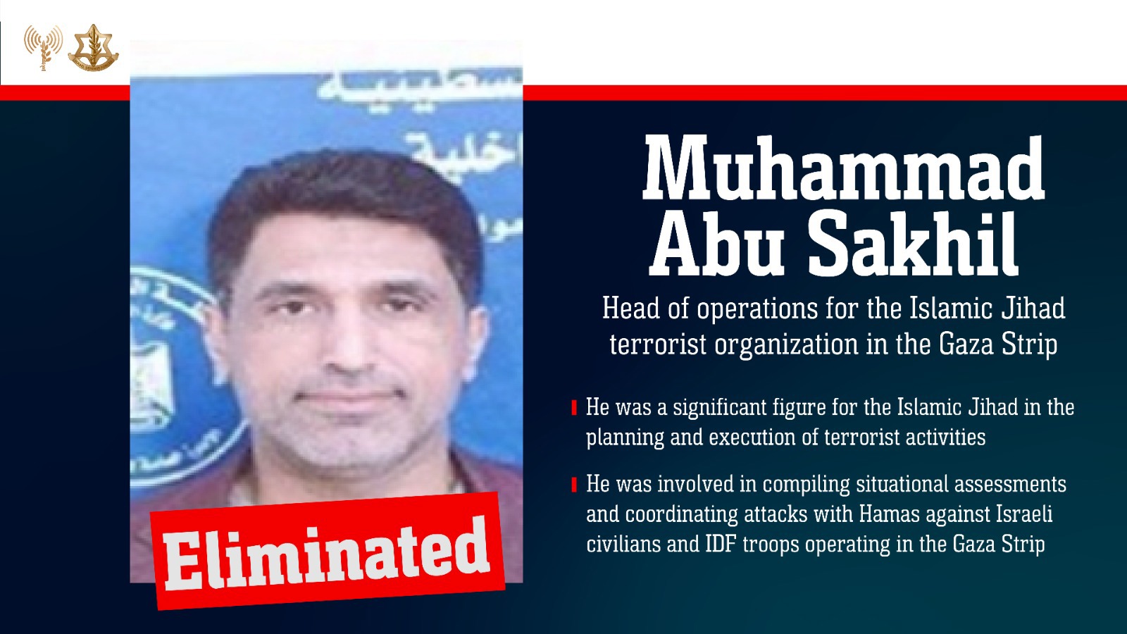 The terrorist was a significant figure for the Islamic Jihad terrorist organization in the planning and execution of terrorist activities and coordinating attacks with Hamas against Israeli civilians and IDF troops operating in the Gaza Strip.