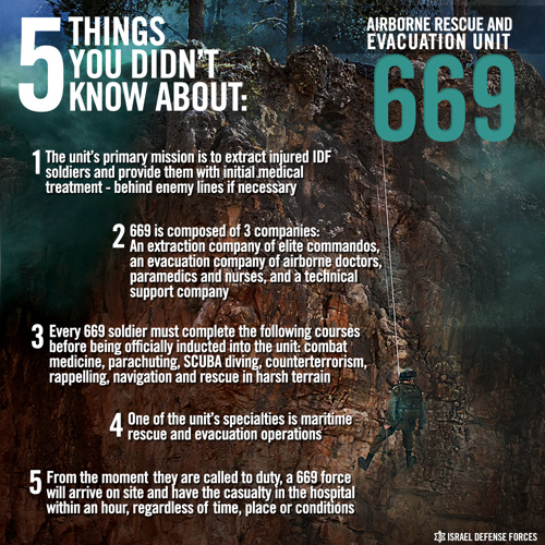 The unit was founded in 1974, after the Yom Kippur War. Its initial mandate was to extract downed Israeli Air Force pilots, but later it also undertook rescue missions of Special Forces soldiers and sailors in distress. Soldiers in the unit are highly trained in both special forces tactics and paramedic skills. Over 18 months, soldiers selected for the unit have to pass courses in combat medicine, parachuting course, Scuba Diving, counter-terrorism, rappelling, rescue under harsh conditions, navigation, and the commanders’ course. Once their training is complete, Unit 669 soldiers sign on for an extra 16 months of service on top of their mandatory three years.