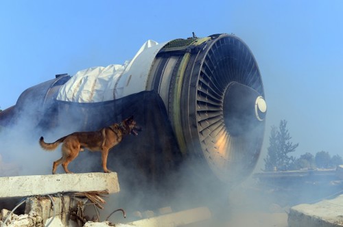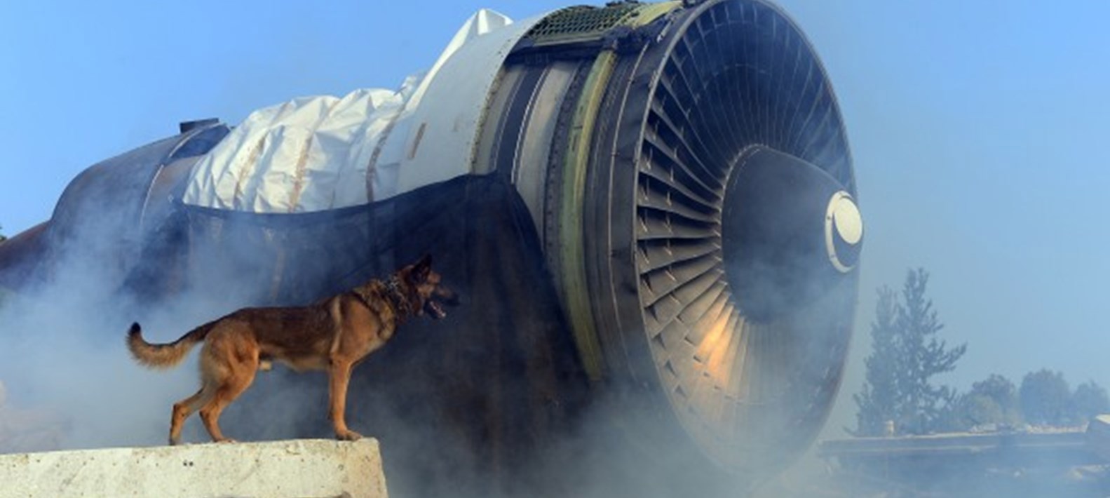 Oketz dog next to an airplane engine during a search and rescue exercise