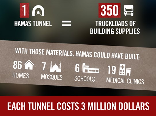 Durant l'Opération Bordure Protectrice, Tsahal a détruit 32 tunnels. SI chaque tunnel coûte environ 3 millions de dollars, cela signifie que la Hamas a dépensé près de 100 millions de dollars pour son réseau de tunnels. Chaque tunnel construit par le Hamas prive le peuple palestinien de maisons, mosquées, écoles et cliniques qui auraient pu voir le jour à la place.