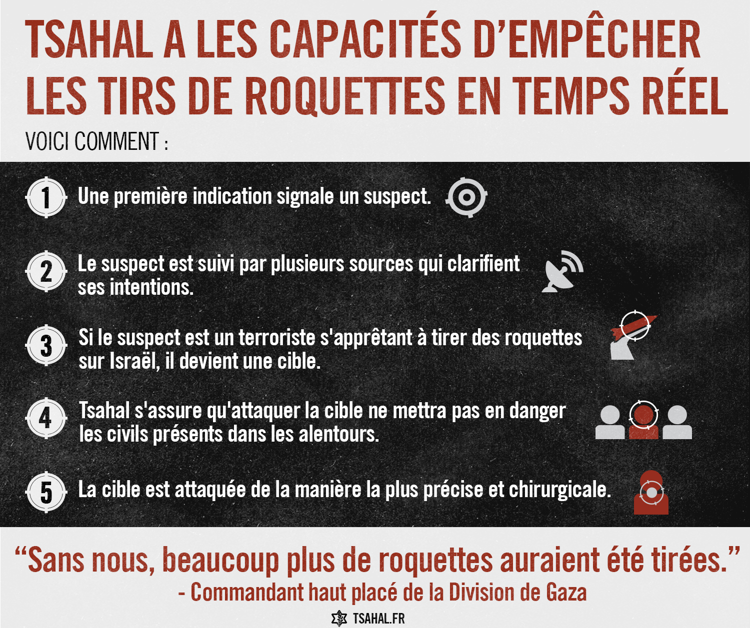 Des méthodes avancées permettent aux forces de Tsahal d’identifier, de traquer et de cibler les terroristes sur le point de tirer des roquettes. Ce processus se déroule en 5 étapes :