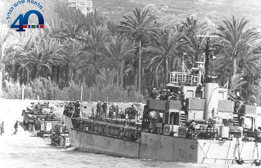 פריקת הנחתות בשפך האוולי שמצפון לצידון. הנחתת 'בת־שבע' עוגנת סמוך לחוף ונחתת 60 מ' בדרכה אל החוף. את התמונה צילמו לוחמי חטיבת הצנחנים 35 מרכס הבוקסתא (אוסף רן שמאי)