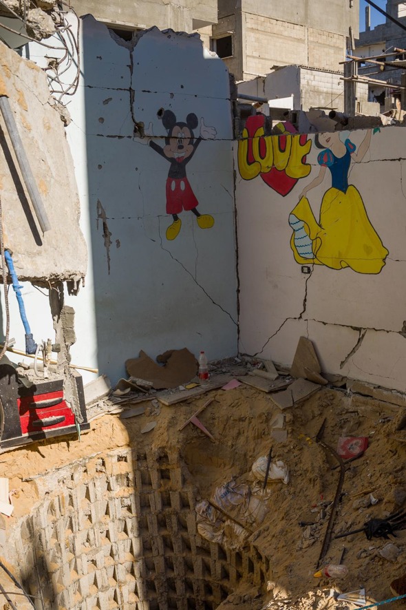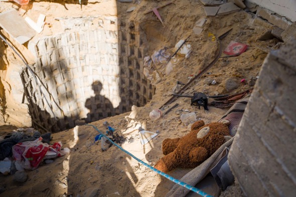 20:01 | הפיר שמוביל למנהרה בה אותרו גופותיהם של החטופים כרמל גת ז"ל, עדן ירושלמי ז"ל, הירש גולדברג-פולין ז"ל, אלכסנדר לובנוב ז"ל, אלמוג סרוסי ז"ל ורס"ר אורי דנינו ז"ל, אותר לצד בובות וציורי קיר של דמויות מצוירות בחצר ילדים.