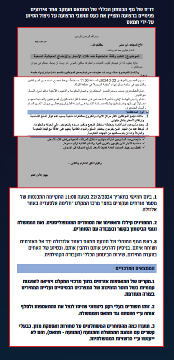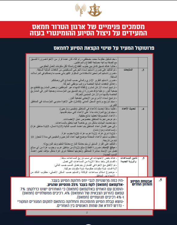 חמאס הגדיר לאורך המלחמה שכמויות שונות (בין 15% ליותר מ-25%) מהסיוע ההומניטרי הנכנס לרצועת עזה יוסט באופן אוטומטי לארגון הטרור וצרכיו. הסיוע שהוקצה לארגון הטרור הועבר למחבלים בשטח או נמכר במחירים גבוהים כדי לגזור רווח על חשבון תושבי הרצועה. מסמך שנחשף כעת מוכיח שהתקבלו החלטות בנושא במהלך המלחמה, בפרט בשינוי אחוז ההקצאה לחמאס בהתאם להערכת המצב בחמאס.